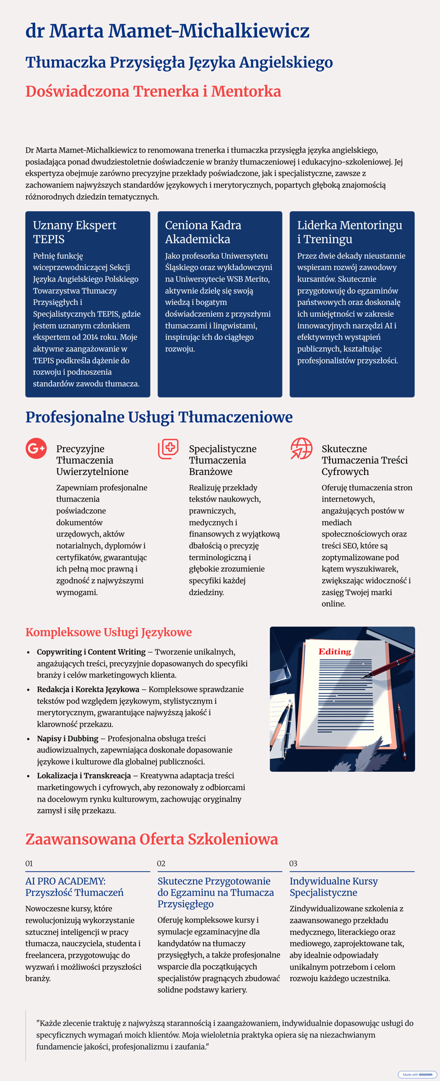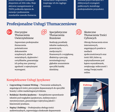 Jestem tłumaczem przysięgłym języka angielskiego z ponad dwudziestoletnim doświadczeniem, specjalizującym się w tłumaczeniach uwierzytelnionych i specjalistycznych. W 2014 roku otrzymałam tytuł członka eksperta Polskiego Towarzystwa Tłumaczy Przysięgłych i Specjalistycznych TEPIS. Oferuję usługi tłumaczeniowe z języka angielskiego na polski i odwrotnie. W mojej ofercie znajdują się tłumaczenia uwierzytelnione oraz zwykłe, pisemne i ustne. Specjalizuję się w tłumaczeniach specjalistycznych, w tym w przekładzie tekstów naukowych, literackich, prawniczych, medycznych i finansowych.